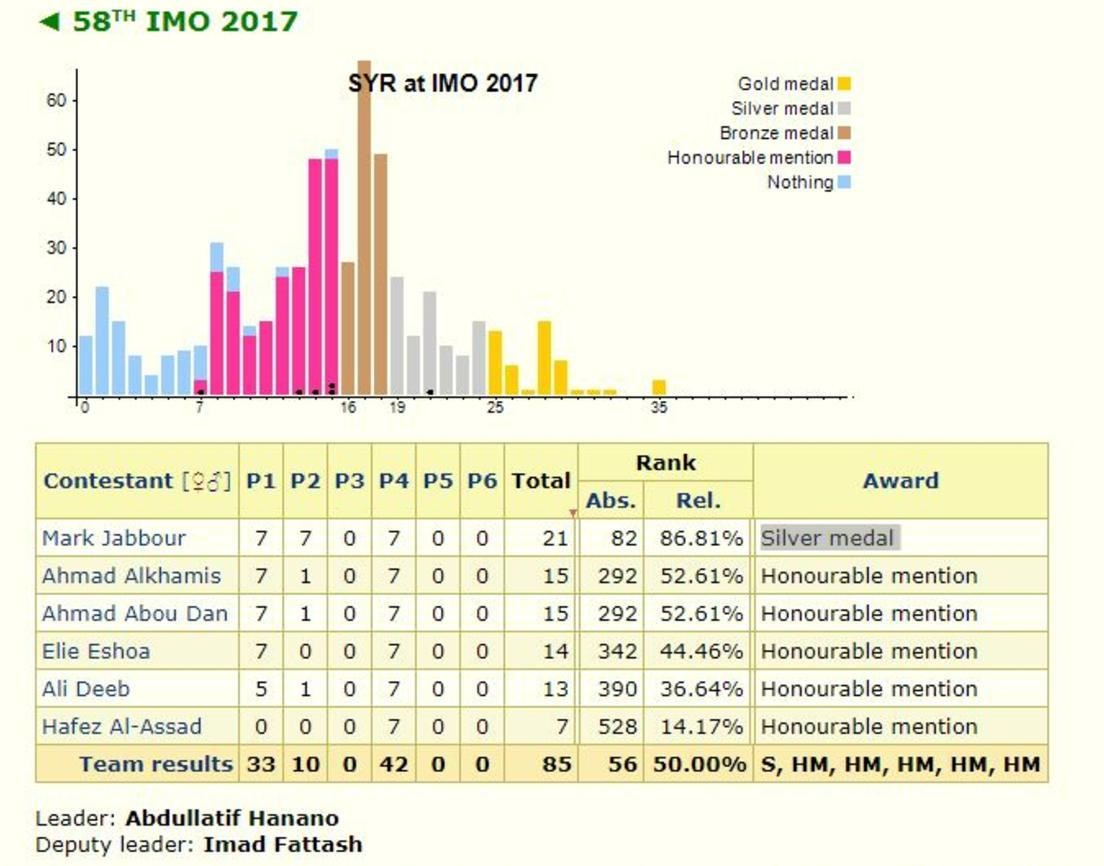 وشارك 6 طلاب سوريين ضمن فريق بلادهم في الأولمبياد العالمي، وحقق حافظ أسوأ نتيجة بين زملائه إذ لم تتجاوز نسبة الإجابات الصحيحة التي حققها 14 في المئة، محرزا المركز 528 من أصل 615 متسابقاً، حسب النتائج التي نشرها موقع الأولمبياد.