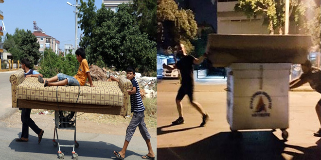 وفي منافسة طريفة، تناقلت وسائل إعلام تركية، الأحد، مقطعاً مصوراً لوكالة إخلاص للأنباء، يظهر أطفالاً سوريين في أنطاليا، يستخدمون عربة التسوق في نقل أريكة، وعلقت بالقول أن هذه الطريقة المبتكرة تنافس طريقة الطلاب الأتراك.