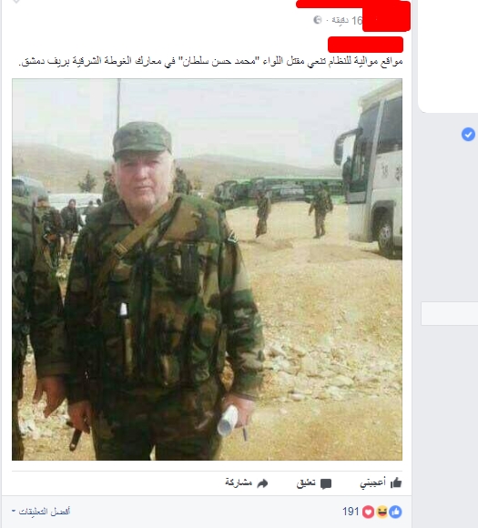 تناقلت صفحات موالية ومعارضة عبر مواقع التواصل الاجتماعي صورة لـ “اللوء محمد حسن سلطان” وقالت إنه قتل في معارك الغوطة الشرقية في دمشق يوم أمس.