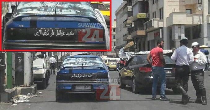 وقالت شبكة “السويداء 24″، إن “سيارة مفيمة تحمل صور العائلة الحاكمة في سوريا اﻷحياء منهم واﻷموات، وتتجول على الطريق المحوري وسط مدينة السويداء أمام أعين شرطة المرور في مدينة السويداء.. شرطة المرور لم تتخذ أي اجراء بحق السيارة المخالفة والتي تتجول أمام أعينهم بشكل يومي مع اﻷغاني التشبيحية بصوت عالي ومزعج إضافة إلى السرعة والتشفيط”.