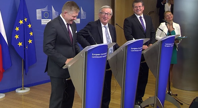 المؤتمر الصحفي المشترك الذي ضم بالإضافة ليونكر كلا من نائبه ماروس سيفكوفيتش ورئيس وزراء سلوفاكيا روبرت فيستو.