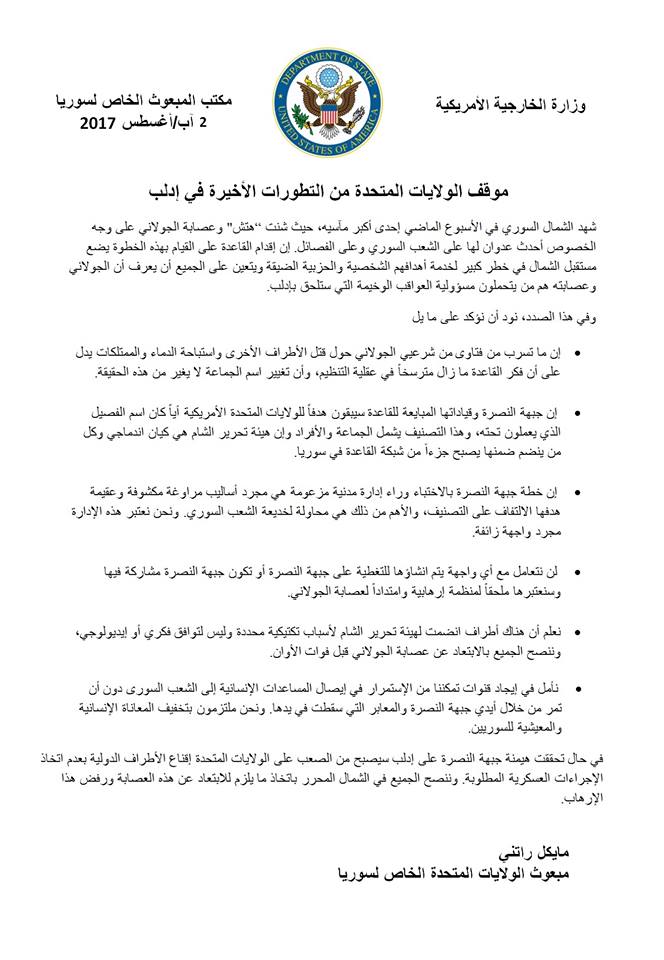 بيان لمبعوث أمريكا في سوريا حول الأوضاع في إدلب : ” إبتعدوا عن عصابة جبهة النصرة .. و إلا ” !