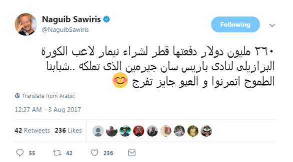 وعلق ساويرس، في تغريدة عبر حسابه الرسمي في تويتو، قائلاً: “260 مليون دولار دفعتها قطر لشراء نيمار لاعب الكرة البرازيلي لنادي باريس سان جيرمان الذي تملكه، شبابنا الطموح، اتمرنوا والعبوا جايز تفرج”.