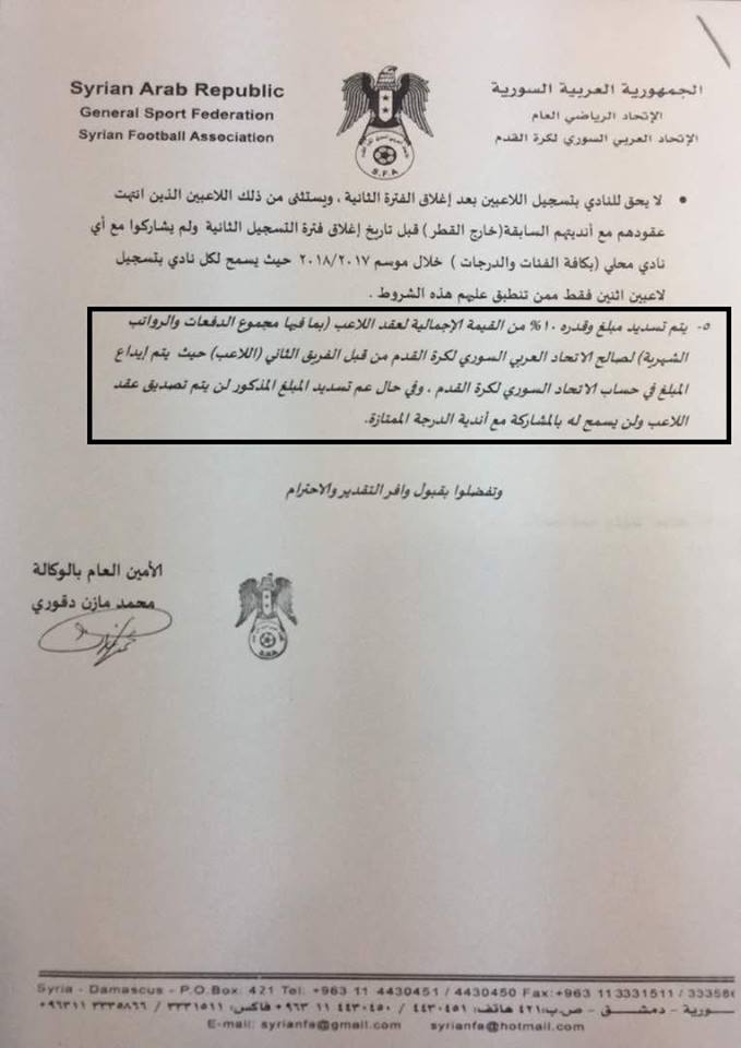 وكان اتحاد كرة القدم في سوريا، والذي يديره الاتحاد الرياضي العام، الذي يقوده ضابط في الجيش (موفق جمعة)، أصدر مؤخراً قراراً يقضي بإجبار اللاعب السوري الذي يرغب بالتعاقد مع ناد يلعب بالدوري السوري بدفع 10 % من قيمة عقده وراتبه.