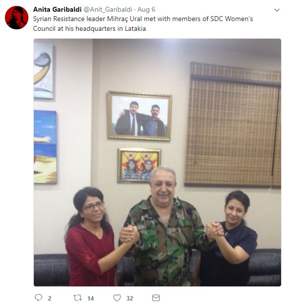 – بالبحث عن الصورة عبر شبكة الإنترنت، كانت نتائج البحث قليلة جداً وكان أول الناشرين حساب على تويتر باسم (Anita Garibaldi)، وقد نشر الصورة يوم الأحد الماضي (6/8)، وقد ذكر أنها مع أعضاء من مجلس سوريا الديمقراطية في مقر كيالي باللاذقية.