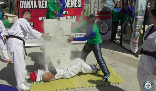 سجل خبير تركي بالقنون القتالية رقماً قياسياً عالمياً جديداً، بعد أن قام بتحطيم ستة عشر حجر بناء على صدره في غضون ثوان قليلة.