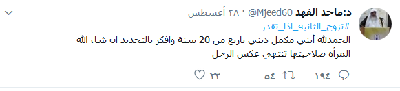 تداول مرتادو مواقع التواصل الاجتماعي تغريدة للداعية السعودي #ماجد_الفهد ، إمام جامع أبو بكر الصديق في المدينة المنورة، وأستاذ الفقه في الجامعة الإسلامية قال فيها: “إن المرأة لها مدة صلاحية تنتهي عكس الرجل.