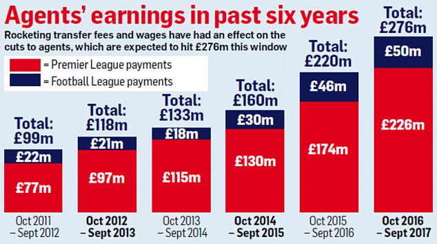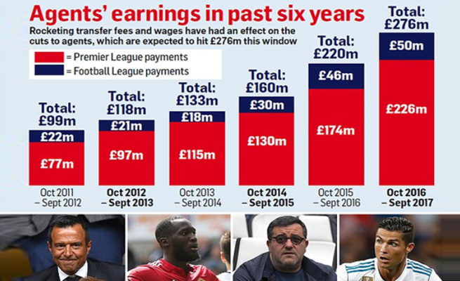 هذا وتتوزع المليار ونصف المليار جنيه إسترليني التي دخلت حسابات الوكلاء على مليار جنيه إسترليني تدفعها الأندية لهم ، نظير مساهمتهم في تسهيل وتسريع إتمام تعاقداتها، بينما تمثل الـ 500 مليون جنيه حصتهم من رواتب موكليهم، والتي تصل نسبتها إلى حدود 5% يدفعها اللاعب لوكيله، نظير مساهمة الأخير في حصوله على أفضل عقد من الناحية المالية خاصة الراتب السنوي ومدى خضوعه للضرائب أو الحوافز المالية المرتبطة بأدائه ومردوده الفني.