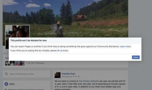 إذ يمكنك الضغط على “حظر” الرئيس التنفيذي لشركة فيسبوك، ويطلب الموقع منك تأكيد نواياك – ولكن عندما تؤكد، يصلك تنبيه بأنه “لا يمكنك حظر هذا الحساب الآن”، وفق ما ذكر موقع هافينغتون بوست بنسخته العربية، ومؤخراً انتقل الأمر ذاته بكافة التفاصيل إلى فرد آخر من عائلة زوكربيرغ، وهي زوجته تشان.