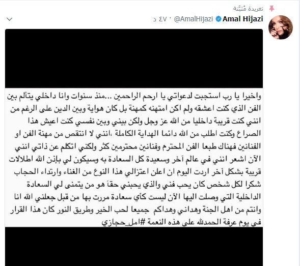 حيث أعلنت المغنية اللبنانية عن اعتزالها هذا النوع من الغناء وارتدائها الحجاب، وهو الأمر الذي اتضح أنه لم يكن وليد اللحظة، بل كان يدور في ذهنها منذ سنوات، وفق ما اوردت قناة العربية، مشيرة إلى كونها تتألم منذ فترة بداخلها بين الفن الذي تعشقه وبين الدين، على الرغم من كونها قريبة من الله بداخلها، إلا أنها كانت تعيش هذا الصراع وتطلب من الله الهداية الكاملة.