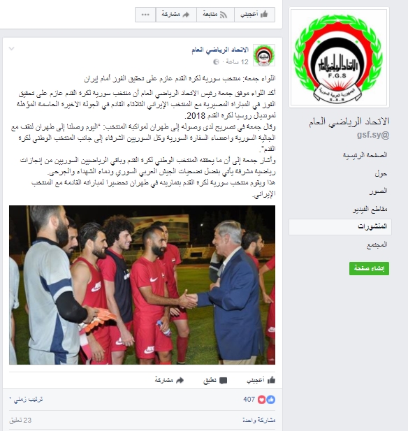 وأشار جمعة إلى أن “ما يحققه المنتخب الوطني لكرة القدم وباقي الرياضيين السوريين من إنجازات رياضية مشرفة يأتي بفضل تضحيات الجيش العربي السوري ودماء الشهداء والجرحى”.