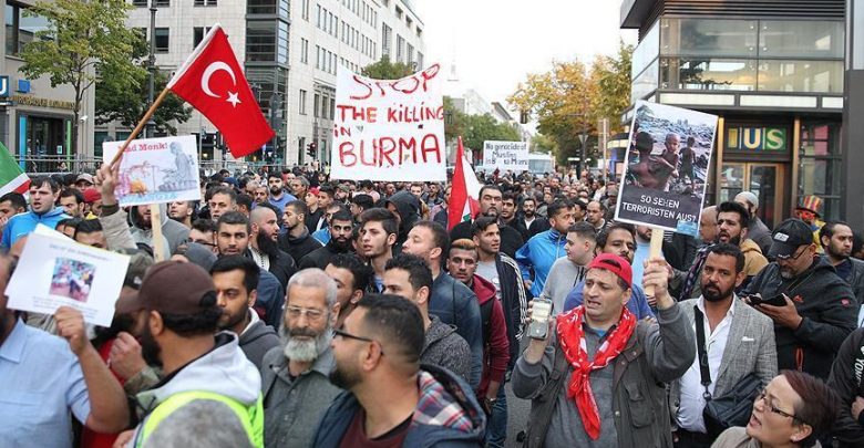تظاهر المئات، مساء الجمعة، في العاصمة الألمانية برلين احتجاجاً على الهجمات ضد مسلمي إقليم “أراكان” في ميانمار.