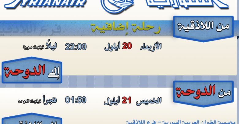 وقالت وزارة النقل، أمس الأحد، إنها خصصت رحلة جوية تتجه إلى الدوحة من اللاذقية، يوم الأربعاء القادم (20/9)، على أن تكون رحلة الإياب في اليوم الذي يليه.