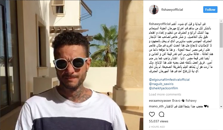 وألمح المخرج في بيانه إلى كون صناع الفيلم يشعرون بالإحباط بسبب هدم مجهودهم نتيجة خطأ فردي، معتبرا أن الفيلم لا علاقة له بما حدث من الفيشاوي.