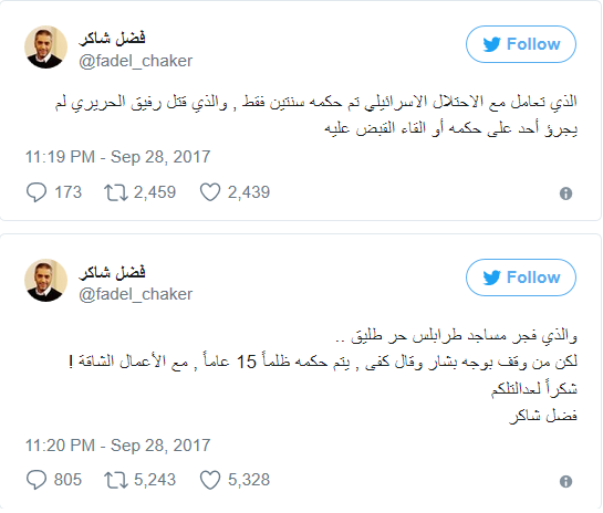 وأضاف الفنان اللبناني في تغريداته: “والذي فجر مساجد طرابلس حر طليق . لكن من وقف بوجه بشار وقال كفى، يتم حكمه ظلماً 15 عاماً، مع الأعمال الشاقة شكراً لعدالتكم”.
