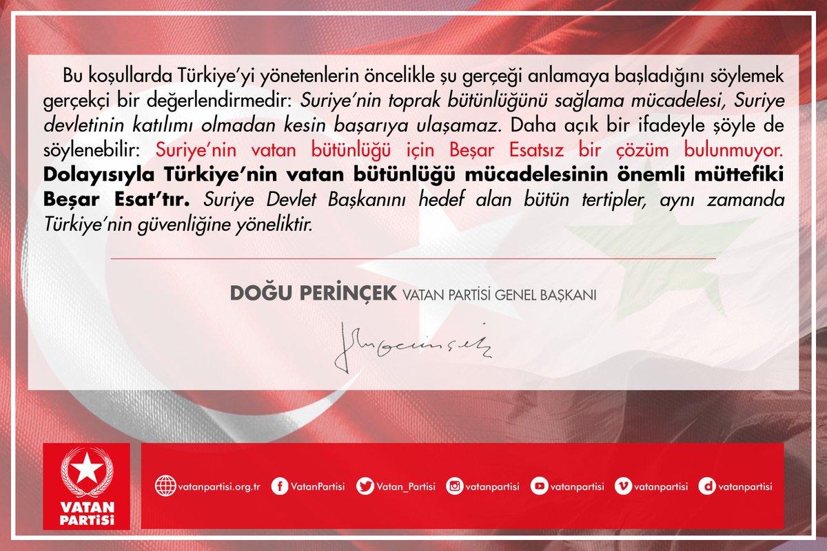 وذكر في تغريدات أخرى: “حزب الوطن التركي يضع حجر الأساس للتعاون بين تركيا وسوريا .. ما يزال حزب الوطن عاملاً حاسماً في مواقف السياسة الخارجية التركية .. بشار الأسد حليف مهم لتركيا في سبيل تحقيق الأمن القومي .. يواصل حزب الوطن تطوير التعاون بين تركيا وسوريا في جميع المجالات”.