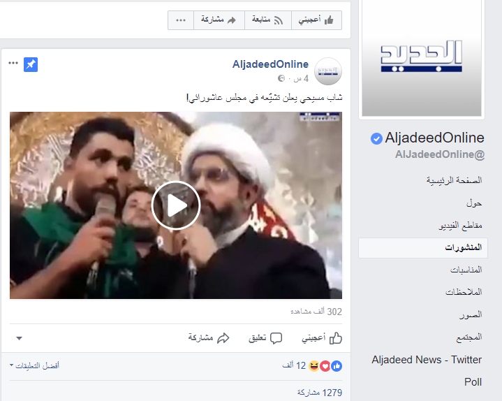 نشرت صفحة قناة الجديد اللبنانية في فيسبوك، مقطعاً مصوراً عنونته بـ “شاب مسيحي يعلن تشيعه في مجلس عاشورائي”.