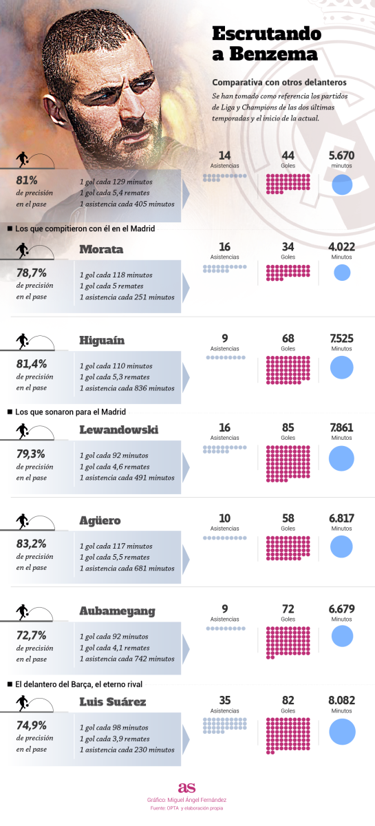 وجاءت المقارنة الرقمية التي تكشف عن تواضع الفعالية التهديفية للمهاجم الفرنسي بن زيمة بعد أيام قليلة من قرار إدارة ريال مدريد بتمديد عقده لغاية عام 2021 بعدما بلغ سن الـ 30 من عمره، في وقت كانت الصحافة المدريدية تترقب التخلي عنه لإفساح المجال أمام التعاقد مع مهاجم آخر يعزز الخيارات التكتيكية للمدرب الفرنسي زين الدين زيدان المتهم بالإنحياز لمواطنه على حساب الفريق بإصراره على إشراكه في التشكيلة الأساسية.