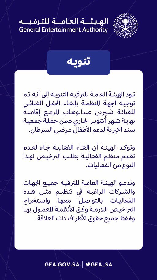 أعلنت الهيئة العامة للترفيه في #السعودية عن إلغاء حفل الفنانة المصرية #شيرين_عبد_الوهاب ، المزمع إقامته نهاية شهر أكتوبر الجاري، ضمن حملة جمعية سند الخيرية لدعم أطفال مرضى السرطان في #الرياض.