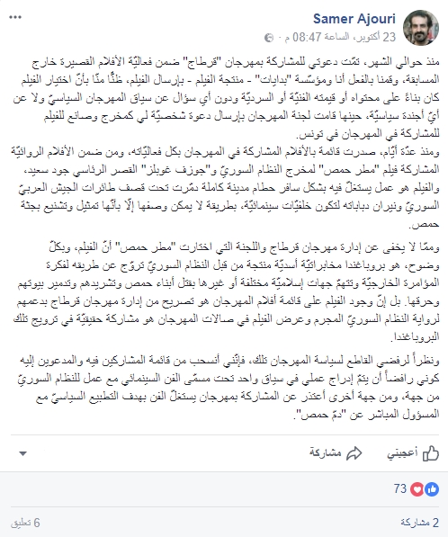 ونظراً لرفضي القاطع لسياسة المهرجان تلك، فإنّني أنسحب من قائمة المشاركين فيه والمدعوين إليه كوني رافضاً أن يتمّ إدراج عملي في سياق واحد تحت مسمّى الفن السينمائي مع عمل للنظام السوريّ من جهة، ومن جهة أخرى أعتذر عن المشاركة بمهرجان يستغلّ الفن بهدف التطبيع السياسيّ مع المسؤول المباشر عن “دمّ حمص”.