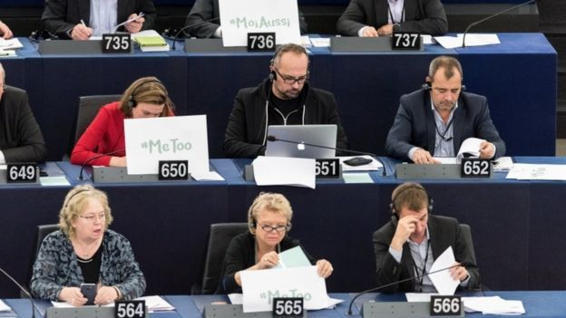 وأثناء نقاش عن التحرش الجنسي في البرلمان الأوروبي الأربعاء، رفع عدد من عضوات البرلمان الأوروبي لافتات كتب عليها “أنا أيضا” تضامنا مع ضحايا التحرش الجنسي وللإعراب عن أنهن ايضا تعرضن للتحرش.