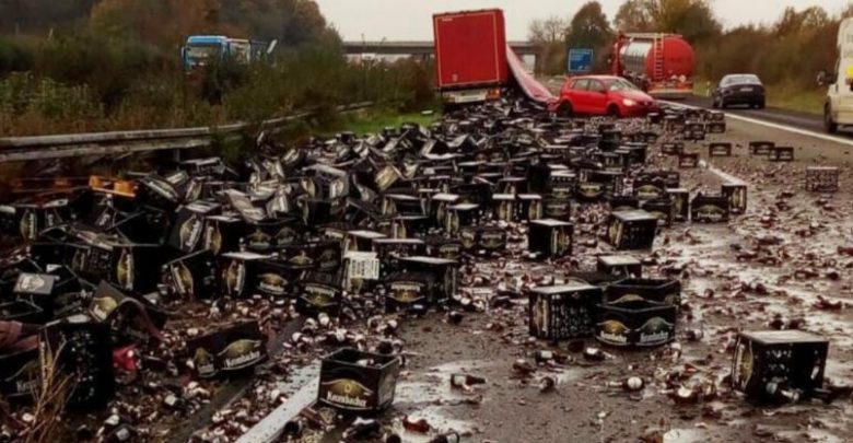 ألمانيا : حادث سير يحطم 30 ألف زجاجة بيرة و يقطع طريقاً سريعاً لساعات !