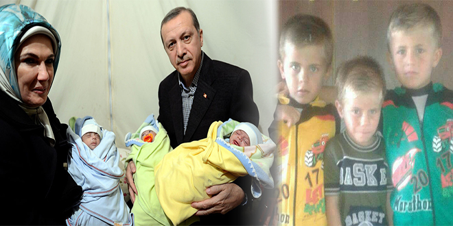 ووفق المعلومات التي رصدها عكس السير، فإن التوأم الثلاثي، ولدوا لخالد حسن الطه، عام 2013، في مخيم بتركيا، وأطلق عليهم الوالد اسم رجب وطيب وأردوغان، أما الطفل الرابع فهو من حلفايا، ولم يتسن لعكس السير التأكد من صحة هذه المعلومة من مصادر مستقلة أو موثوقة، أو الوصلو إلى اسم الطفل.