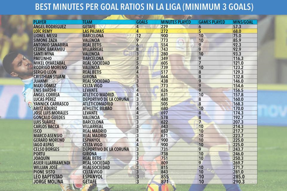 وجاء ثانياً المهاجم لوك ريمي هداف نادي لاس بالماس الإسباني بمعدل هدف كل 68 دقيقة بتوقيعه على 4 أهداف خلال مدة زمنية بلغت 272 دقيقة، وفق ما ذكرت صحيفة إيلاف، وهي المدة التي تعادل المباريات الخمس التي لعبها مع فريقه.