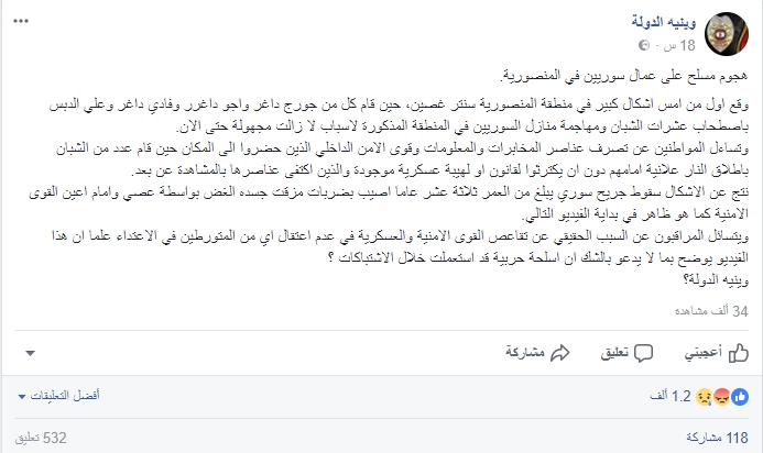 وكانت الصفحة اللبنانية قد نشرت مقطعاً مصوراً، في تشرين الأول الماضي، يظهر اعتداء عدد من الشبان اللبنانيين، على سوريين وسط الشارع، أمام جمهرة من الناس، دون تدخل من أحد.