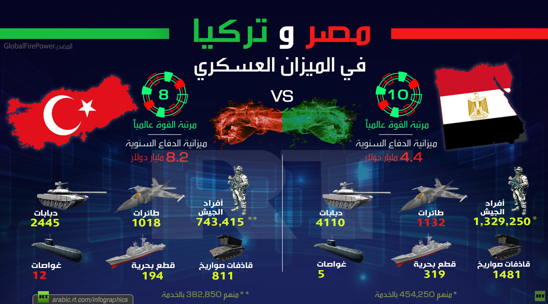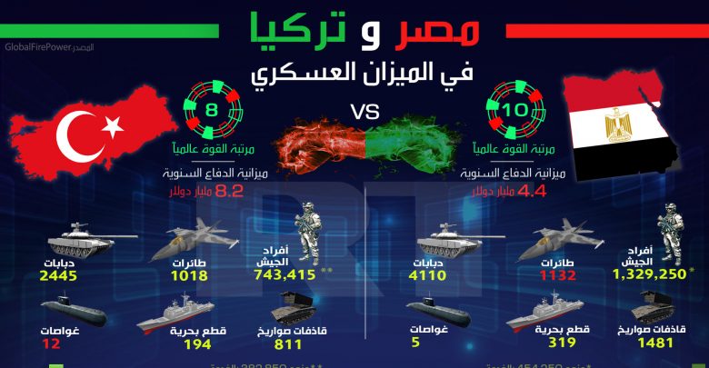 نشرت قناة “روسيا اليوم” الروسية، “إنفوغراف” قارنت فيه بين الجيشين التركي والمصري، واصفة إياهما بالأكبر في الشرق الأوسط.