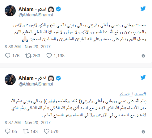أما أحلام، فغرّدت مرتين بعنوان “حصنوا أنفسكم”، وقالت: “حصّنت وطني و نفسي وأهلي وذريتي ومالي وبيتي بالحي القيوم الذي لا يموت والانس والجن يموتون ورفع الله عنا السوء والأذى ولا حول ولا قوه الابالله العلي العظيم اللهم وصل اللهم وسلم على محمد وعلى اله الطيبين الطاهرين والمسلمين أجمعين”.