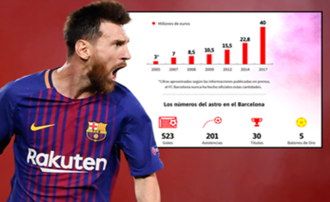 وكانت الخزينة الكتالونية قد رصدت لميسي راتباً سنوياً بثلاثة ملايين يورو فقط في موسمه الأول (2004-2005) حيث كان لا يزال – حينها – على دكة الاحتياط قبل ان يتم رفعه إلى سبعة ملايين يورو في عام 2007 بعدما اظهر اللاعب علامات النجومية ، خاصة بعد هدفه الأسطوري في مرمى ليفانتي في مسابقة كأس الملك ، والذي جعل الجميع يتأكد بأن “البرغوث” الأرجنتيني سيكون نسخة كربونية من مواطنه دييغو مارادونا ، لتسارع إدارة النادي إلى تمديد عقده وتحسين راتبه .