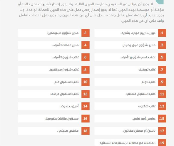 جددت وزارة العمل والتنمية الاجتماعية في السعودية التأكيد على قائمة لـ19 مهنة يمنع أن يزاولها غير السعوديين، بعد أن أصبحت “مسعودة” بنسبة 100%.