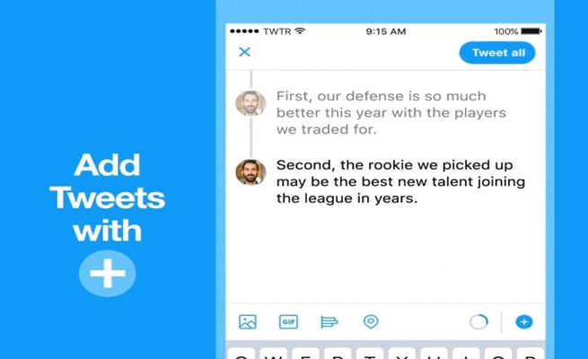 وآلية ذلك تتم عبر الضغط على زر (+) لإضافة تغريدة جديدة بعد كتابة التغريدة الأولى، وهكذا بعد الانتهاء من إضافة كل تغريداتك تضغط على زر Tweet All لنشرها جميعاً دفعة واحدة كتغريدات متسلسلة.
