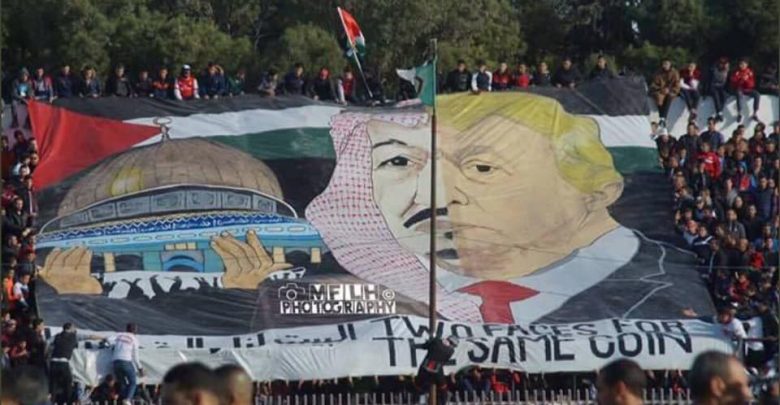 وتناقل ناشطون في موقع “تويتر” للتواصل الاجتماعي صورة لجماهير رياضية في أحد مدرجات ملاعب كرة القدم الجزائرية وهي تحمل لافتة كبيرة تظهر الملك السعودي والرئيس الأمريكي وإلى جوارهما صورة للمسجد الأقصى، وكتبت تحتها عبارة باللغة الإنجليزية “two faces of the same coin” (وجهان لنفس العملة)، بالإضافة إلى عبارة “البيت لنا والقدس لنا”.