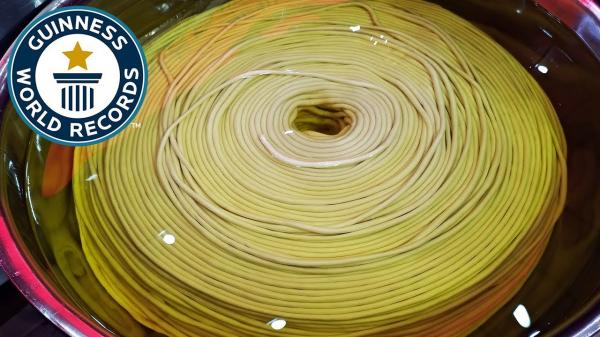 وقال مسؤولون في موسوعة غينيس إن شركة زيانغنيان للأغذية قامت بإعداد أطول حبل معكرونة في العالم تحت إشراف فريق من الطهاة المختصين، حيث بلغ طول حبل المعكرونة 3218 متراً.