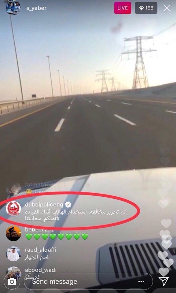 ووفق ما اوردت قناة روسيا اليوم، صرح القائد العام لشرطة دبي اللواء عبدالله خليفة المري، أنه تم رصد المخالفة وإبلاغ شرطة دبي عنها، والتي قامت بدورها بمتابعة الموضوع عبر قنواتها الخاصة بمواقع التواصل الاجتماعي، وتمت متابعة صاحب حساب إنستغرام لحوالي ربع ساعة قبل تحرير مخالفة مرورية له.