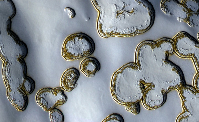 وقال الخبراء في “ناسا” وفق ما اوردت وكالة نوفوستي الروسية، إن انخفاض درجة الحرارة يغير مظهر الكوكب حيث يتحول غاز ثاني أكسيد الكربون الذي يضمه الغلاف الغازي إلى جليد جاف يغطي سطح المريخ ويشكل هناك زخارف غريبة.