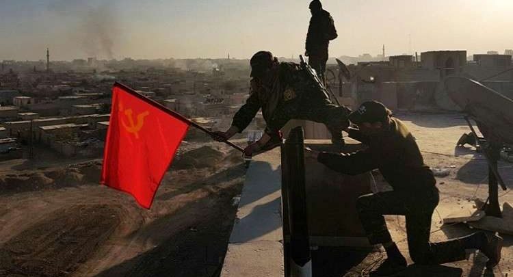 قالت قناة “روسيا اليوم” الروسية، إن مقاتلين من “كتيبة الحرية الأممية” العلم السوفيتي الأحمر فوق الرقة بعد تحريرها من قبضة داعش، في محاكاة لرفع راية النصر السوفيتية فوق برلين، في آخر أيام الحرب العالمية الثانية.