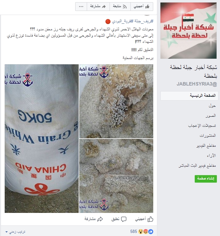 وقالت شبكة “أخبار جبلة لحظة بلحظة”، مرفقة تعليقها بصورة للمعونات: “معونات الهلال الاحمر لذوي الشهداء والجرحى لقرى ريف جبله رز معفن مدود ؟؟؟ إلى متى سيبقى الاستهتار بأهالي الشهداء والجرحى من قبل المسؤولين اي بضاعة فاسدة توزع لذوي الشهداء ؟؟؟! التعليق لكم !!!! برسم الجهات المعنية”.