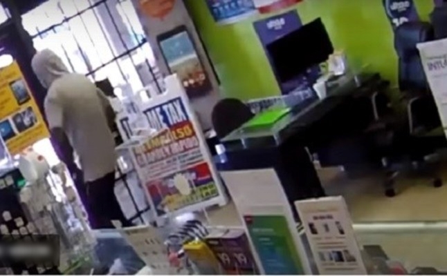 وظهر اللص وهو يحاول فتح الباب وتحطيمه بعدما اكتشف المصيدة التي وقع بها، حيث أطلق النار على القفل أربع مرات دون أن ينجح في تحطيمه، الأمر الذي دفعه للتوسل للأشخاص المتواجدين في خارج المتجر للسماح له بالخروج.