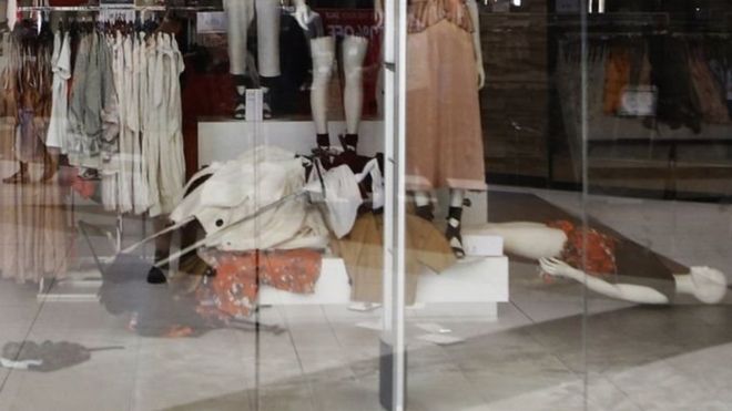 وأظهر مقطع فيديو النشطاء وهم يعبثون بطاولات العرض وركل قضبان الملابس ومجسمات عرض الأزياء.