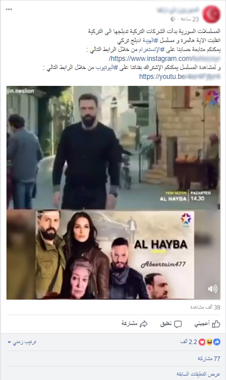 نشرت صفحة سورية مختصة بشكل رئيسي بتناقل أخبار السوريين في تركيا، معلومات خاطئة عن دبلجة إحدى الشركات التركية لمسلسل “الهيبة” السوري اللبناني، إلى اللغة التركية، وعرضه على قناة “STAR” التركية المعروفة، داعية متابعيها للاشتراك بقناتهم على يوتيوب لمتابعته.