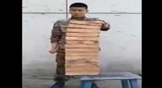 انتشر على مواقع التواصل الاجتماعي فيديو يظهر جنديا صينيا يكسر 14 لوحا من الطوب ويقسمها إلى نصفين بضربة يد واحدة.