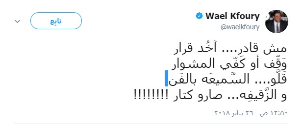 وكان كفوري قد كتب عبر صفحته الخاصة على “تويتر”: “مش قادر آخد قرار.. وقف أو كفي المشوار.. قلو السميعه بالفن.. والزقيفه صارو كتار!”، وهو ما فسره الكثيرون بأنه يفكر في الاعتزال.