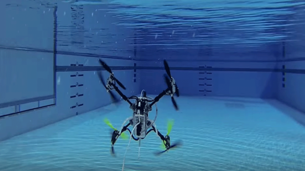 فيما يعد مفاجأة من تحت الماء في حمام سباحة، برزت أولا 4 مراوح على سطح الماء، ثم ظهرت قمة على شكل قبة تبين أنها جسم درون أو quadcopter، ارتفعت في الهواء أمام المتفرجين في معرض مستقبل قوات البحرية الأميركية للعلوم والتكنولوجيا، بحسب الوصف التفصيلي الذي أورده موقع “defensesystems”.