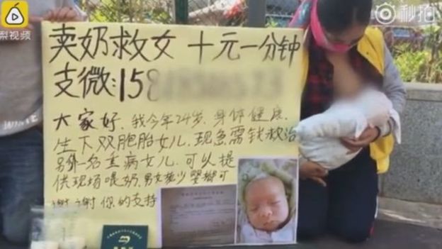 وتقول الأم إنها تبيع حليب ثديها من أجل جمع المال الكافي في أقرب وقت لأن إحدى بناتها مريضة في العناية المركزة بمستشفى باو آن الحكومي في شينزين.