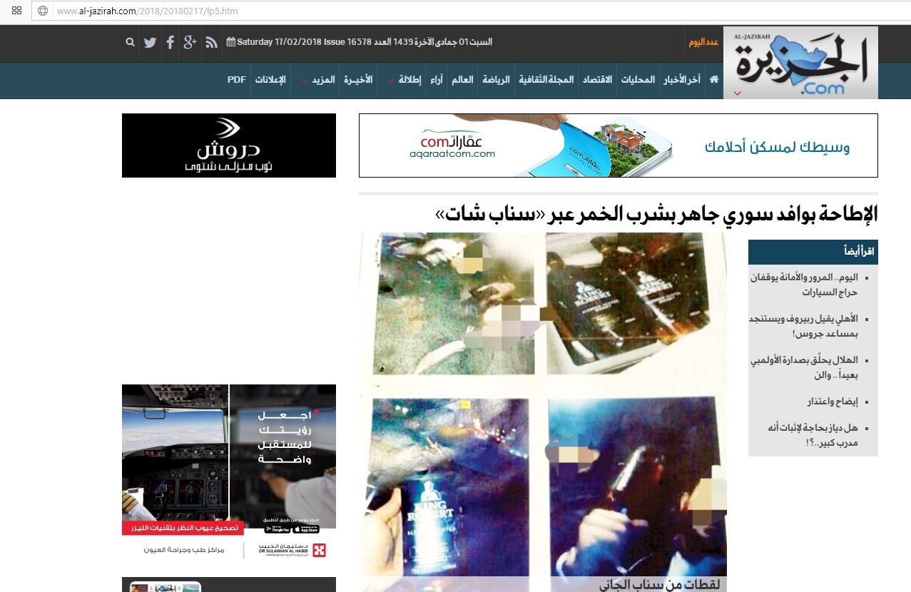 صحيفة سعودية : ” الإطاحة بوافد سوري جاهر بشرب الخمر عبر سناب شات “