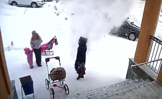 صورت الكاميرات لحظة سقوط كتلة ضخمة من الثلج من سطح أحد المباني فيما كانت تقف امرأة وطفلتها الصغيرة التي تحاول جرّ أمها بعيدا عن الخطر دون أن تدري لتنقذها من كسور بالغة كحد أدنى.