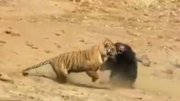 معركة شرسة بين نمر و دبة في الهند ( فيديو )